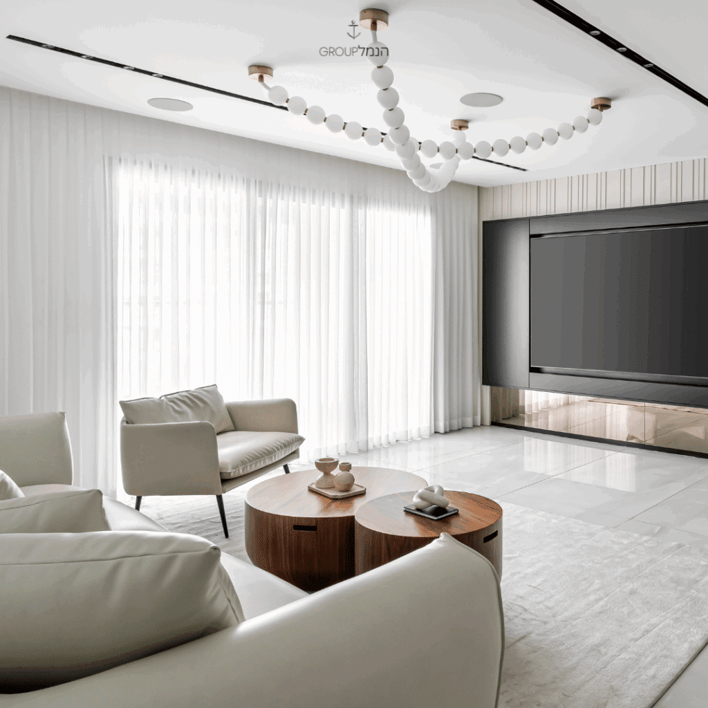 אם הספה בהירה, מינימליסטית ועשויה בד אריג פשוט, שולחן עץ מלא או שיש יעניק לחלל את החמימות והעומק החסרים.