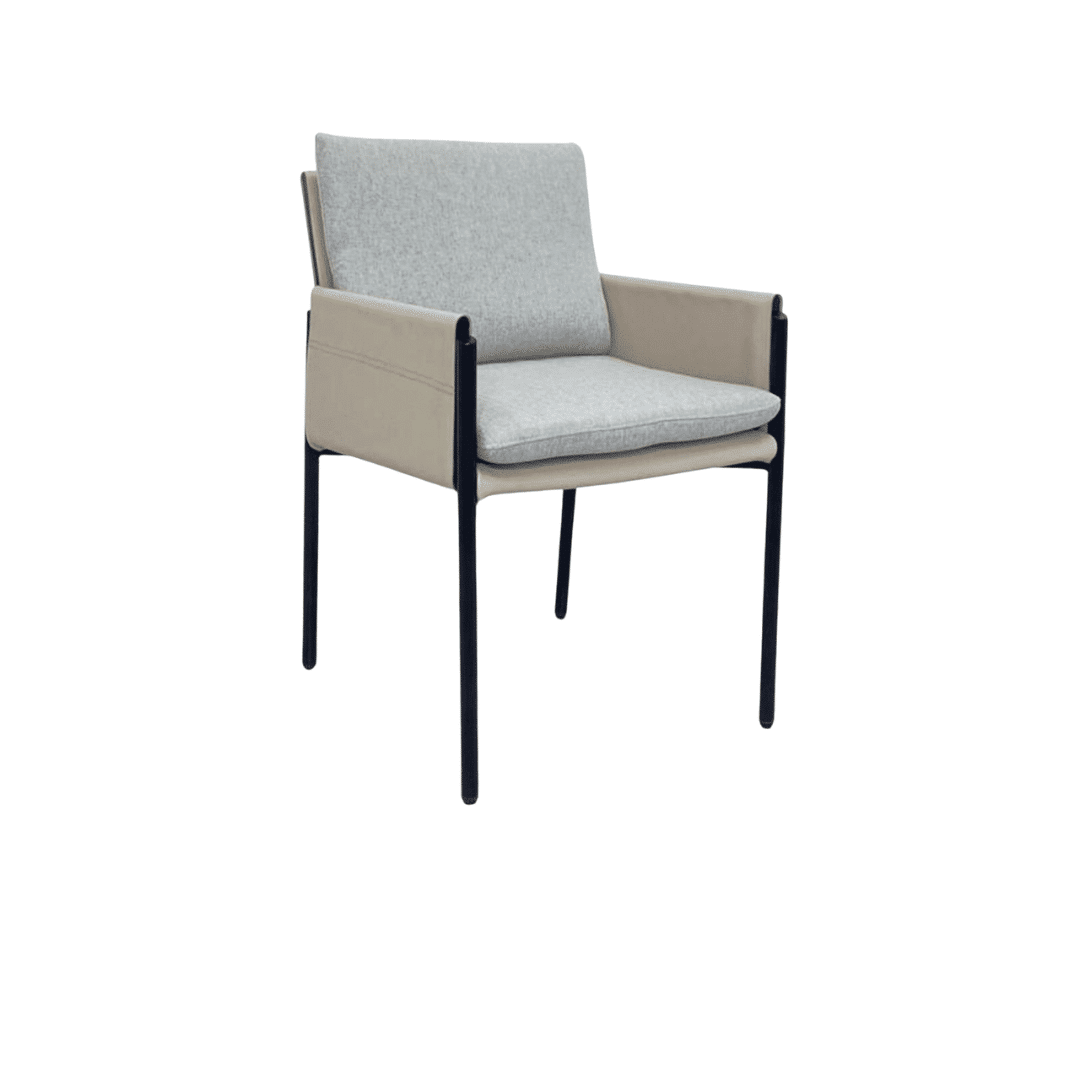 כיסא מעוצב ואיכותי, מושב בד בצבע אפור עם ידיות דמוי עור בצבע בז’ בשילוב רגלי ברזל שחורות בעל יציבות ועמידות גבוהה.