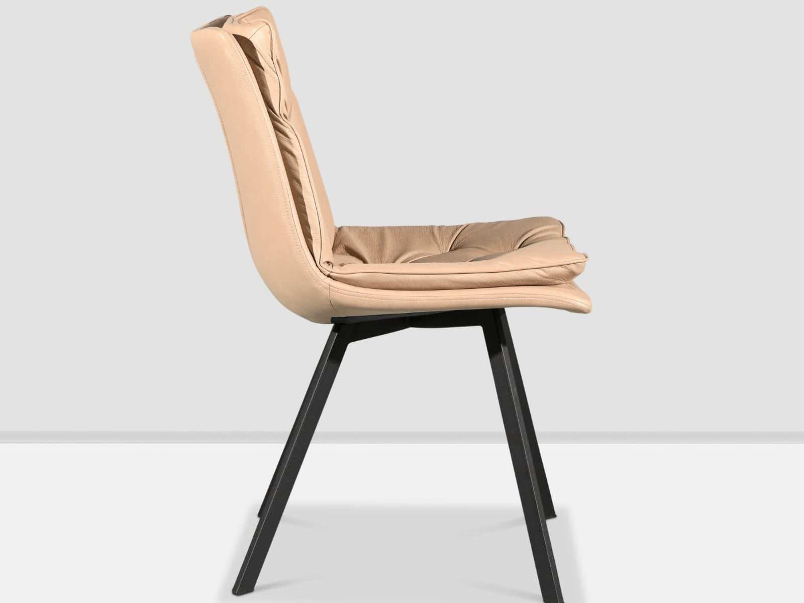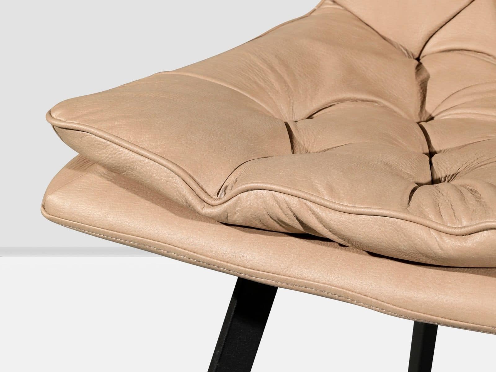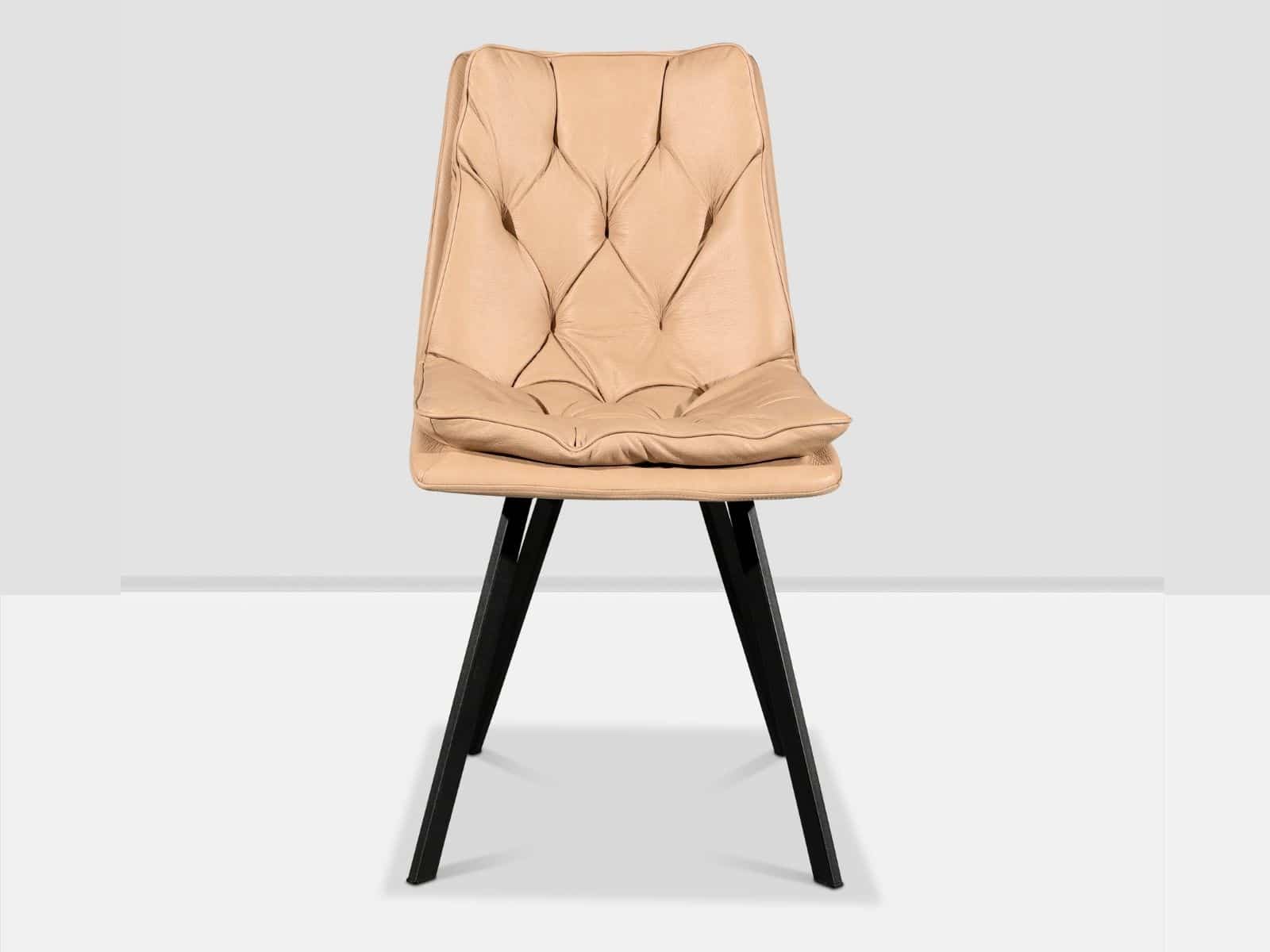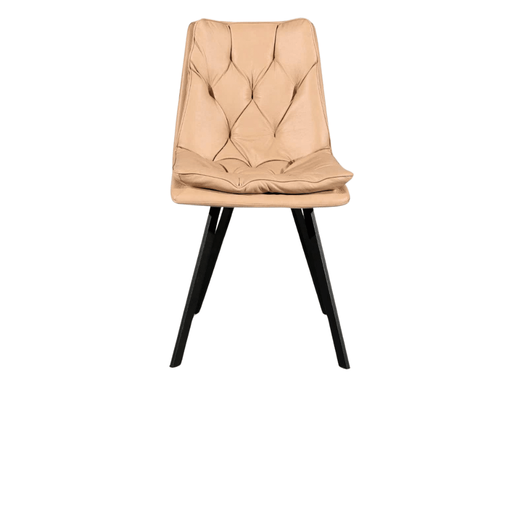 כסא מעוצב ואיכותי, מושב דמוי עור קפיטונאז’ גוון בז’, עם רגלי ברזל שחורות, בעל יציבות ועמידות גבוהה.