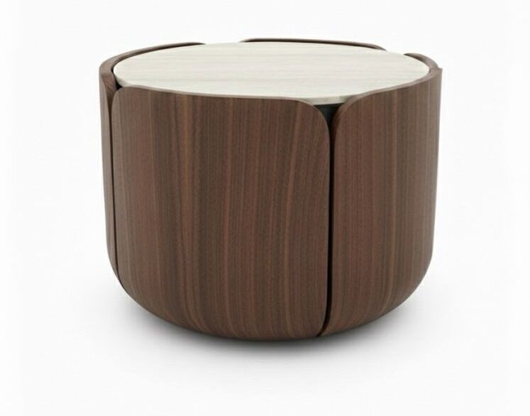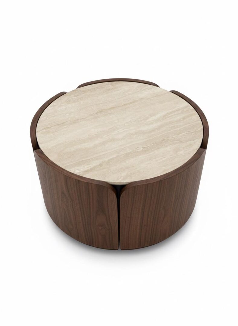 השולחן משלב בהרמוניה בין פורניר אגוז עשיר ומבריק למשטח טרוונטין יוקרתי , היוצר ניגודיות ויזואלית מרהיבה.