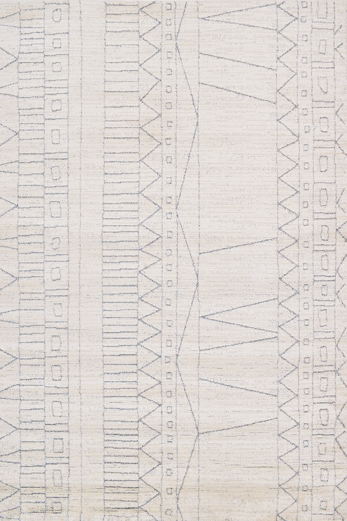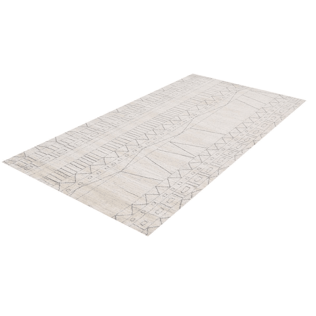 שטיח לבן מהקולקציה החדשה של מאטיס, המעוצב בסגנון אתני עם צורות גיאומטריות בהשראת הסגנון המרוקאי. השטיח עשוי חוטי פוליאסטר משולב בחוטי פוליפרופילן הארוגים במכונה, ומשלבים את הצבע הלבן והאפור עם דוגמאות מושלמות לאורך השטיח