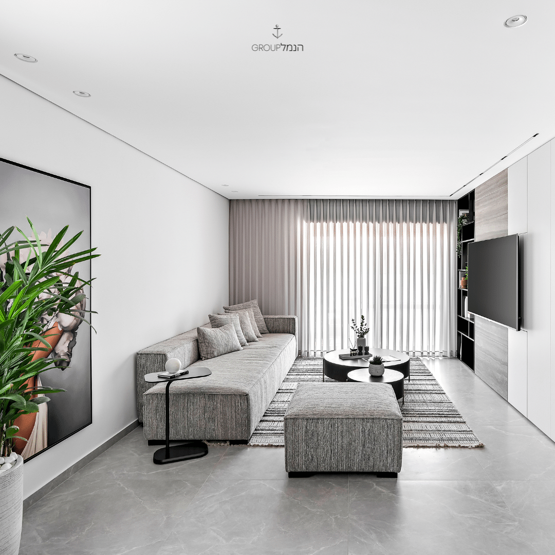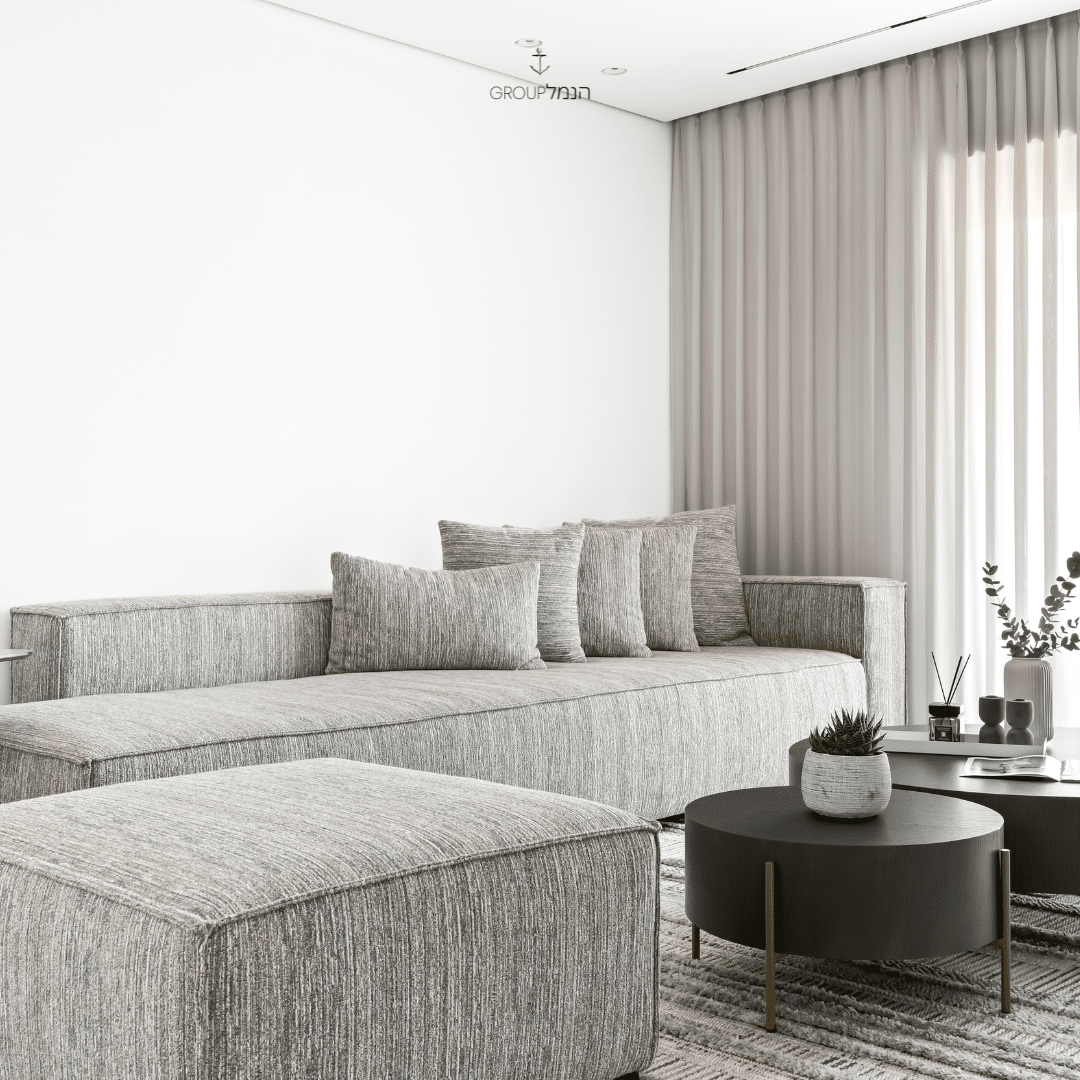 רהיטי הפרויקט: ספה דגם Cordo | הדום דגם Cordo | שולחן סלון Unic עגול גדול | שולחן סלון Unic עגול קטן ביבוא בלעדי של קבוצת הנמל.